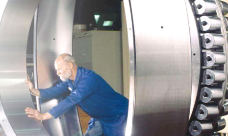 圆锥滚子轴承属于分离型轴承,轴承的内、外圈均具有锥形滚道。该类轴承按所装滚子的列数分为单列、双列和四列圆锥滚子轴承等不同的结构型式。单列圆锥滚子轴承可以承受径向负荷和单一方向轴向负荷。当轴承承受径向负荷时,将会产生一个轴向分力,所以当需要另一个可承受反方向轴向力的轴承来加以平衡。 单列圆锥滚子轴承承受轴向负荷的能力取决于接触角,即外圈滚道角度,角度越大,轴向负荷能力也越大。圆锥滚子轴承中用量最多的是单列圆锥滚子轴承。在轿车的前轮轮毂中,用上了小尺寸的双列圆锥滚子轴承。四列圆锥滚子轴承用在大型冷、热轧机等重型机器中。 单列圆锥滚子轴承有一个外圈,其内圈和一组锥形滚子由筐形保持架包罗成的一个内圈组件。外圈可以和内圈组件分离,按照ISO圆锥滚子轴承外形尺寸标准的规定,任何一个标准型号的圆锥滚子轴承外圈或内圈组件应能和同型号外圈或内圈组件实现国际性互换。即同型号的外圈除外部尺寸、公差需符合ISO492(GB307)规定外,内圈组件的圆锥角、组件锥体直径等也必须符合互换的有关规定。 通常,单列圆锥滚子轴承外圈滚道的圆锥角在10°~19°之前,能够同时承受轴向载荷和径向载荷的联合作用。锥角愈大,承受轴向载荷的能力也愈大。大圆锥角的轴承,后置代号加B,锥角在25°~29°之间,它可承受较大的轴向载荷。另外,单列圆锥滚子轴承可以在安装过程中调整游隙的大小。 双列圆锥滚子轴承的外圈(或内圈)是一个整体。两个内圈(或外圈)小端面相近,中间有隔圈,游隙是靠隔圈的厚薄来调整的, 也可用隔圈的厚薄来调整双列圆锥滚子轴承的预过盈。 四列圆锥滚子轴承,此种轴承的性能与双列圆锥滚子轴承基本相同,但比双列圆锥滚子轴承承受的径向载荷更大,极限转速稍低,主要用于重型机械,如轧钢机等。 多密封双、四列圆锥滚子轴承,提供长寿命、多密封双、四列圆锥滚子轴承。对轴承进行个性化全新设计,改变全密封轴承传统设计方法,采用密封与防尘相结合的新型密封结构型式,改善密封效果,提高密封性能。多密封双、四列圆锥滚子轴承与开式结构轴承相比,寿命提高20%~40%;润滑剂消耗量降低80%。 四列圆锥滚子轴承的安装(安装滚子轴承): 一、四列圆锥滚子轴承内圈与辊颈的配合一般是带间隙的,安装时先将轴承装入轴承箱,然后把轴承箱装入轴颈。 二、四列圆锥滚子轴承外圈与轴承箱孔亦采用动配合,先将外圈A装入轴承箱。出厂时在外圈、内圈以及内外隔圈均印有字{HotTag}符符号,安装时必须按字符符号的排列顺序依次装入轴承箱。不可任意互换,以防止轴承游隙的改变。 三、全部零件都装入轴承箱后,将内圈与内隔圈、外圈与外隔圈轴向靠紧。 四、测量外圈端面与轴承箱盖板之间的缝隙宽度,以确定相应密封垫片的厚度。 多密封轴承用后置代号XRS标志。 圆锥滚子轴承主要承受以径向为主的径、轴向联合载荷。轴承承载能力取决于外圈的滚道角度,角度越大承载能力越大。该类轴承属分离型轴承,根据轴承中滚动体的列数分为单列、双列和四列圆锥滚子轴承。单列圆锥滚子轴承游隙需用户在安装时调整;双列和四列圆锥滚子轴承游隙已在产品出厂时依据用户要求给定,不须用户调整。 圆锥滚子轴承有圆锥形内圈和外圈滚道,圆锥滚子排列在两者之间。所有圆锥表面的投影线都在轴承轴线的同一点相聚。这种设计使圆锥滚子轴承特别适合承受复合(径向与轴向)负荷。轴承的轴向负荷能力大部分是由接触角α决定的;α角度越大,轴向负荷能力就越高。角度大小用计算系数e来表示;e值越大,接触角度越大,轴承承受轴向负荷的适用性就越大。 圆锥滚子轴承通常是分离型的,即由带滚子与保持架组件的内圈组成的圆锥内圈组件可以与圆锥外圈(外圈)分开安装。 圆锥滚子轴承广泛用于汽车、轧机、矿山、冶金、塑料机械等行业。